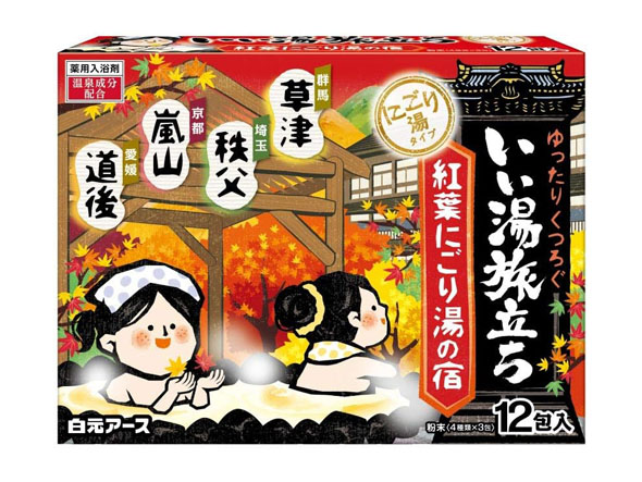 自宅のお風呂で手軽に温泉気分が味わえる「いい湯旅立ち」シリーズ。「紅葉にごり湯の宿」は、草津(群馬県)、秩父(埼玉県)、嵐山(京都府)、道後(愛媛県)をイメージした、4種類の香りと湯色で温泉気分を楽しめます。