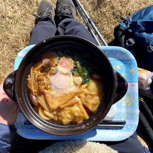 そんな鍋割山の名物は鍋焼きうどん。山頂の鍋割山荘で提供されているもので、1人用土鍋で調理されたアツアツのうどんを食べることができます。1年中食べることができますが、気温が低い年末は特に格別! 温かいお出汁やたっぷりの具材は、冷えた体をじんわりと温めてくれます。なお週末は行列になることもあるので、鍋焼きうどんを確実に食べたい人は、早めの到着をおすすめします。