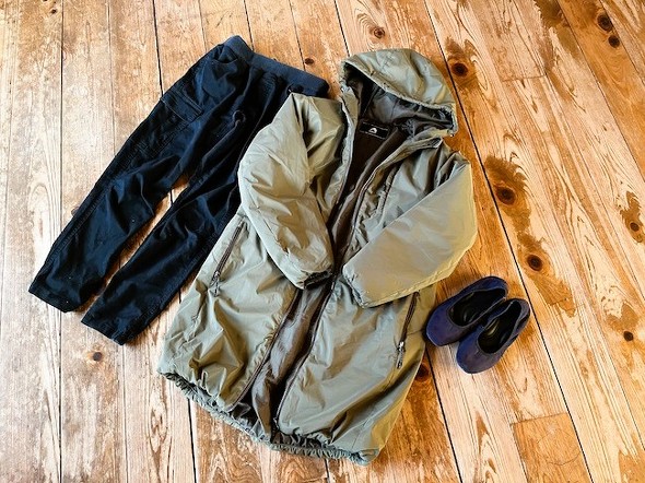 筆者がこの冬ほぼ毎日使っていたのが、「レディース撥水パデッドロングフーディ」です。中綿入りのふんわりとした印象のロング丈アウターは、買い物に行くときはもちろん、日課の散歩のときも使っていました。