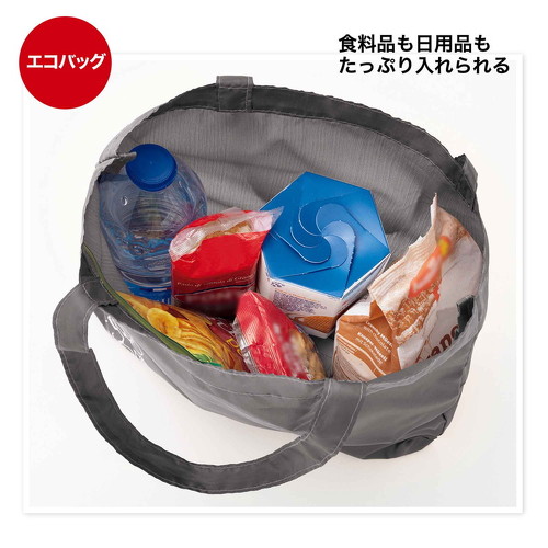 バッグのサイズは約44.5(高さ)×39.5(幅)cm。ストラップは、肩に掛けられる長さです。食料品や日用品などがしっかり入るので、日々のお買い物バッグとして活躍。また、持ち運びやすいのでサブバッグとしても使用可能です。