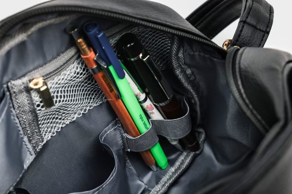 リップやペンを立てて収納できるゴムバンドも付いているため、決まった場所に物を収納したい人にもおすすめ。大きなファスナーポケットには充電コードなど散らかりがちな物を入れておけます。