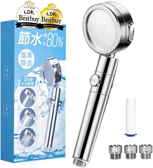日丸屋製作所の「シャワーヘッド」は、極細穴によって水圧を快適なものにしつつ、最大約80%の節水を実現する製品です。手元の止水ボタンでこまめに水を止めることができ、水流は3段階の調整が可能。水道代とガス代の大きな節約につながります。