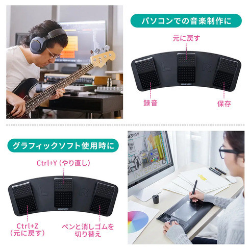 「400-MA179」は、足でパソコンを操作できる有線式フットペダルです。専用ソフトでショートカットなどの機能を割り当てることができるプログラマブル仕様。マウス操作や文字列などの割り当ても可能です。