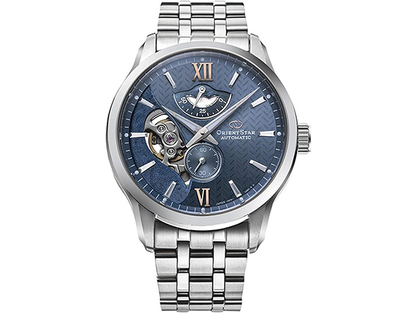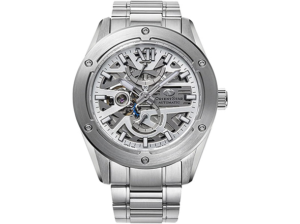 オリエントスター初のシリコン製がんぎ車を搭載した自動巻ムーブメントを採用しており、60時間の駆動と日差+15〜−5秒の高精度を実現しているのも特徴。デザインだけでなく、オリエントの技術力の高さも楽しめるモデルです。