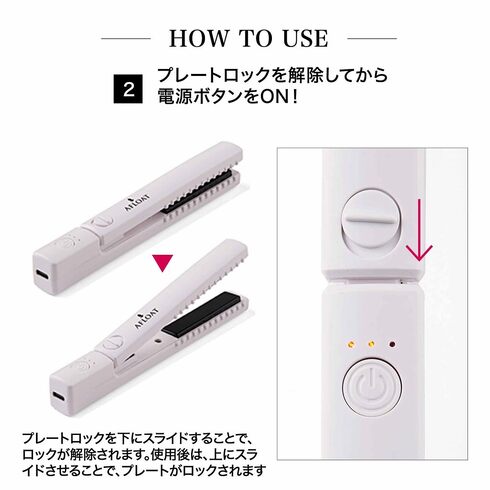 使う際は、プレートロックを下にスライドしてロック解除してから電源を入れます。本体下部にUSBポートがあるためUSBケーブルのプラグをそこに差し込み、もう一方のプラグをUSB電源などに差し込んで使います。