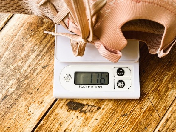 筆者は23cmを購入。実際に重さを計測してみたところ、約176g(片足)でした。履いているのを忘れるほど……とまでは言えませんが、足への負担をあまり感じずに歩けています。