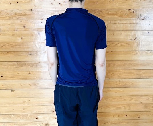 アイスアーマー半袖クルーネックの襟ぐりは、大きく開いていません。ハイネックではありませんが、鎖骨までしっかり隠れます。首裏の開きも少ないので、日焼け防止にもなります。