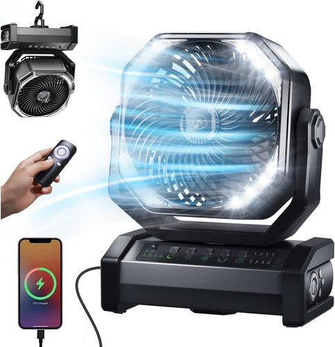 充電式の扇風機なら、ポータブル電源がなくても使用できます。Socool fanの「充電式扇風機」は、2万mAhほどの大容量タイプなので、外出前に自宅で満充電にしてから持ち出せば、長時間の使用が可能。ポータブルエアコンとの併用にもおすすめです。実売価格は9000円前後です。