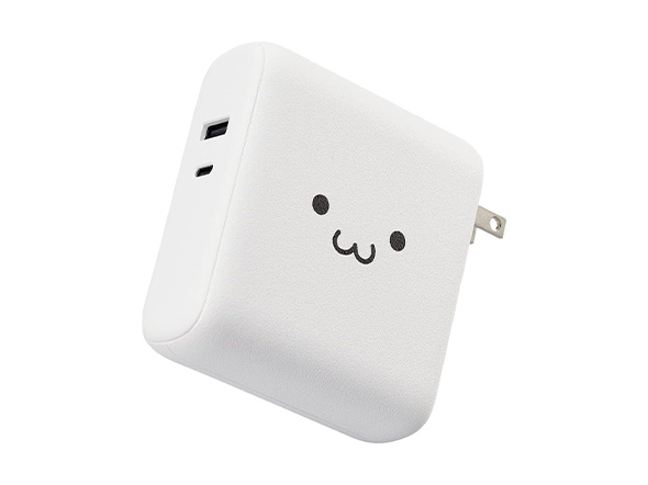 エレコムのオリジナルキャラクター「しろちゃん」の顔がプリントされたコンセントプラグ付きモバイルバッテリーです。