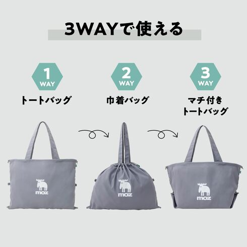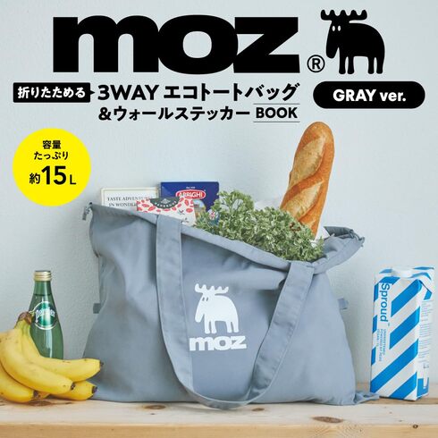 「moz 折りたためて変形できる! 3WAYエコトートバッグ&ウォールステッカーBOOK」は、グレーのバッグが付く「GRAY ver.」と、ブラックのバッグが付く「BLACK ver.」の2種を展開。「BLACK ver.」は宝島社の公式通販サイト「宝島チャンネル」もしくはセブンネットショッピング、セブン‐イレブンでの限定販売となります。
