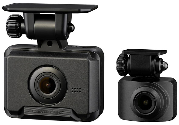 コムテックの前後カメラモデル。コンパクトな本体サイズ(フロント:67×49.3×30.9mm)が特徴です。
