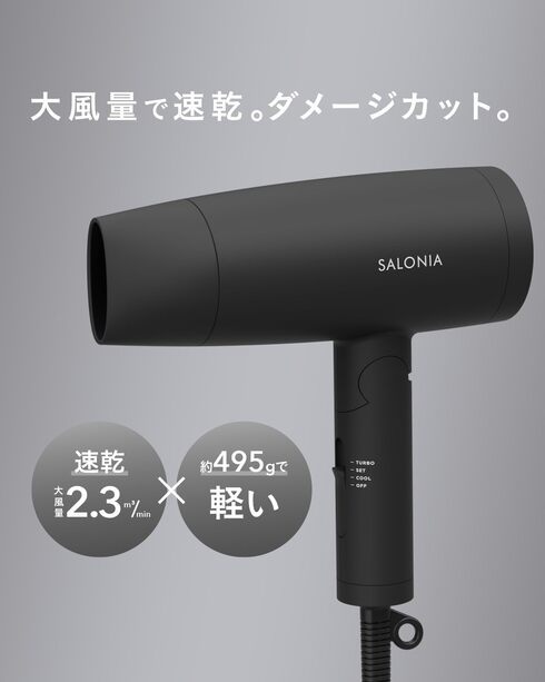 サロニアの「ヘアドライヤー SL-013BK」は大風量で速乾できるので、ドライ時間の短縮と髪へのダメージを抑えられます。マイナスイオン機能も搭載しており、髪表面に効果的にアプローチ。髪に潤いを与えてくれます。