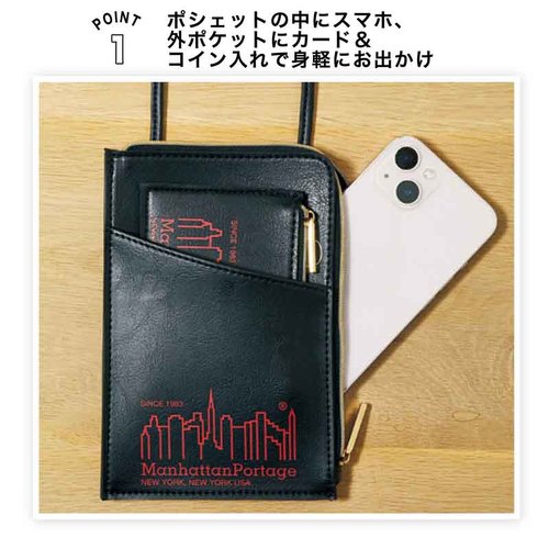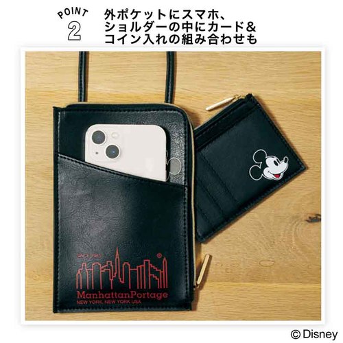 肉厚なレザー調の素材に、マンハッタンポーテージのロゴが上品なスマホポシェットとカード&コイン入れの2点セットです。ポシェットの外ポケット内側にはミッキーがプリントされており、外からはミッキーが少しのぞいているように見えるのが、非常にかわいらしいアイテムです。