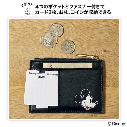 またカード&コイン入れも、レザー調の素材が高見えするアイテム。前面にはマンハッタンポーテージのロゴが、背面にはミッキーマウスがプリントされています。