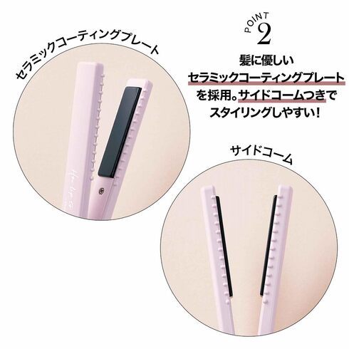 ヘアアイロンにはセラミックコーティングプレートを採用。髪へのダメージを抑えながらも、しっかりとスタイリングが可能です。また、ヘアアイロンのサイドにはコームが付いているため、髪をとかしながらスタイリングできるようになっています。