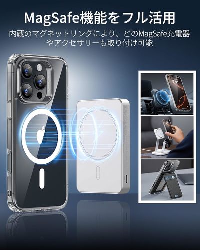 ESRの「Classic Hybridケース」は、強力なマグネットと衝撃吸収に優れた「エアガードコーナー」を搭載した製品です。1500gの保持力を持つマグネットは、MagSafeアクセサリーをしっかりと固定。充電器やスマホリングなどを安心して使用できます。