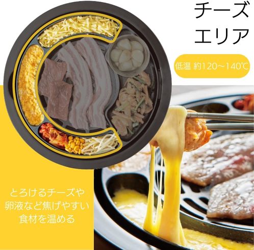 スモークレスで焼き肉を楽しみつつ、平プレートエリアでたれ漬けの料理を作ったり、焼き肉エリアを囲むその他の低温ゾーンでチーズなどを溶かしたりすることも可能です。