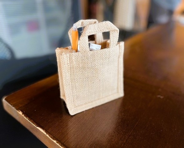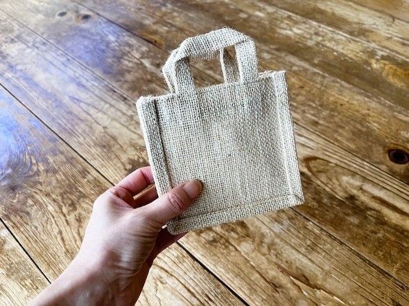 無印良品の「ミニジュートバッグ」のサイズは、10.5(縦)×12(横)×6(マチ)cm。写真は、ミニジュートバッグを手に持った状態です。おしゃれでかわいらしいデザインなので、ちょっとしたプレゼントを入れるのに使うと喜ばれそうです。