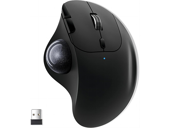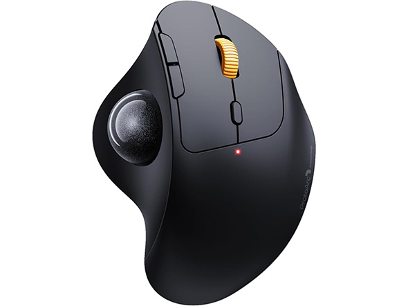 手首の疲れを軽減するエルゴノミクス形状を採用したトラックボールです。縦に握れる形状になっており、手首をひねらずに自然な角度のまま操作をすることができます。
