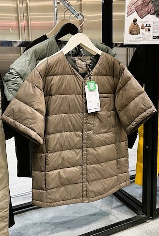 「リペアテック洗えるフュージョンダウンハーフジャケット」は、針穴がふさがる「リペアテック」と洗濯可能な「洗えるフュージョンダウン」を搭載した、人気アウターの半袖タイプです。半袖なので価格は2500円とお手頃で、意外と使い勝手が良いアウターです。