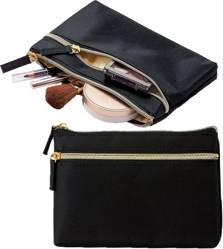 エソールの「化粧ポーチ スリム」は、ゴールドのファスナーや内側のサテン生地がおしゃれな印象の薄型ポーチ。メイン収納部と、外側にポケットを1つ備えたシンプルな構造で、ちょっとしたものを持ち歩きたいときにぴったりです。