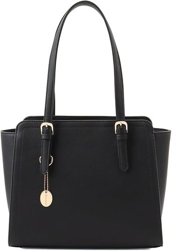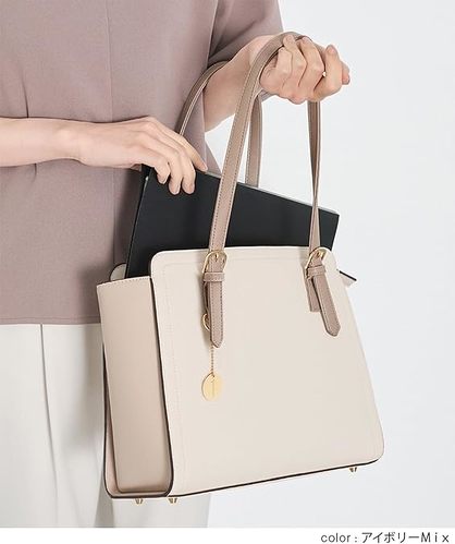 きちんと感のあるフェイクレザー素材を使用したきれいめトートバッグ。ベルトハンドルとゴールドプレートのチャームが上品なアクセントになっており、スーツスタイルやオフィスカジュアルコーデに合わせれば、大人かわいい通勤コーデが完成します。