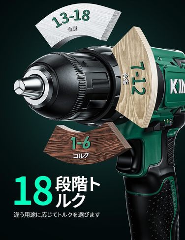 最大トルクが約35Nmの比較的パワフルな電動ドリルドライバー。18段階のトルク調節や無段階調節のトリガー、高速と低速の2段変速スイッチを採用しており、用途に合わせてスピードやパワーを細かく変更できるのが特徴です。