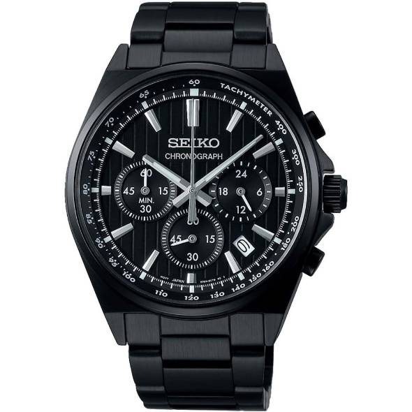 ケースからブレスレットまでオールブラックでまとめた、精悍で存在感のあるクロノグラフ(クオーツ)です。
