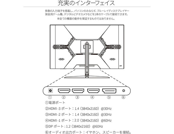 映像入力端子はDisplayPort 1.2×1、HDMI 2.0×1、HDMI 1.4×2。使用中のLGのモデルよりもHDMIポートが1つ多いので、PC、ゲーム機2台、ブルーレイレコーダーと、筆者の手持ちの機器がすべて接続できます。