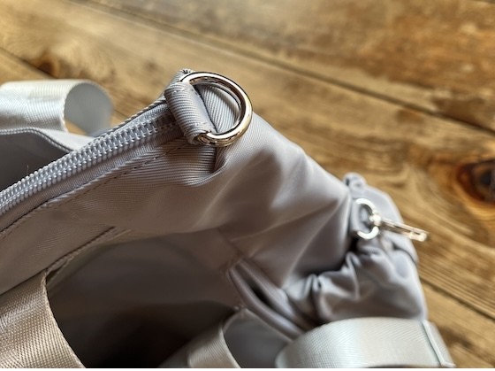 バッグの両端にはDカンループが付いており、取り外しが可能なショルダーストラップがあれば、ショルダーバッグとして使うこともできます(2WAYトートリュックにはショルダーストラップは付いていません)。2WAYトートリュックの本体サイズは約31(縦)×33(横)×12.5(幅)cm、容量は約13Lです。