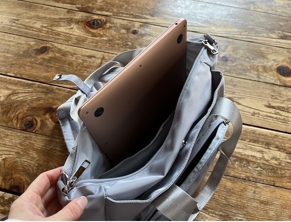 メインポケット内には、クッションが付いたポケットもあります。ポケットは、13インチのノートパソコンが縦向きに入るものの、一部バッグ本体からはみ出してしまうようなサイズ感です。横向きに入れようとすると、幅が足りずに入りませんでした。iPad miniなどのタブレットは問題なく入ります。