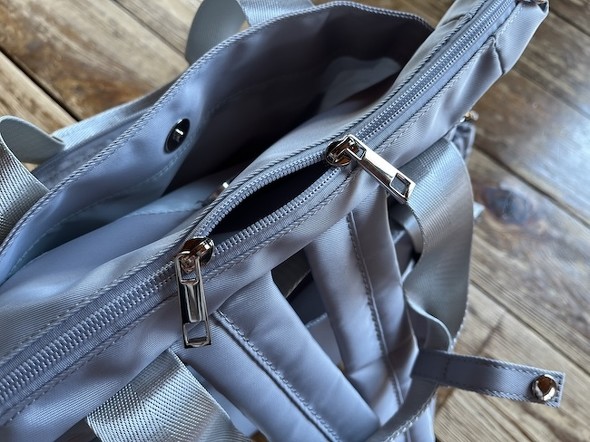 2WAYトートリュックには全部で11のポケットがあります。正面に3つ、両サイドに2つ、内側に3つ、背面に2つ、そしてメインポケット1つです。正面のポケットにはファスナーが付いているので、鍵やリップなどを入れるのにぴったりです。
