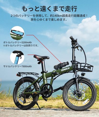 7800mAhの大容量バッテリーを積んでおり、約80kmという長距離のアシスト走行が可能。別売りのボトルバッテリーをセットすれば、最大140kmまで走行可能距離を伸ばせます。またスマホを充電できるなど、緊急時に役立つ機能も付いています。