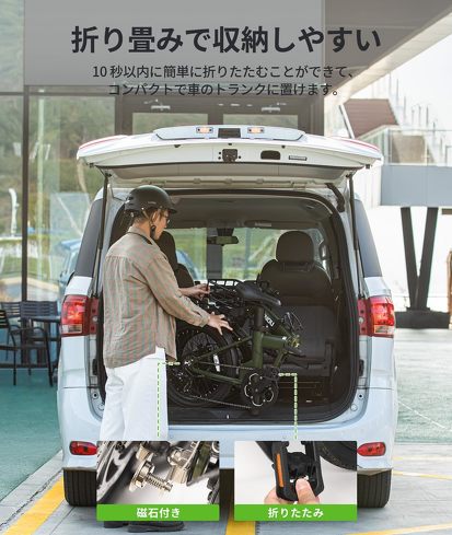 最短10秒で折りたためる小型の電動自転車。車のトランクに積めるくらいコンパクトにたためるので、旅先に持ち運んでサイクリングを楽しむこともできます。衝撃吸収性のある強力なサスペンションや20インチの分厚いタイヤを使用し、小型ながら安定した走行を実現しているのも魅力です。