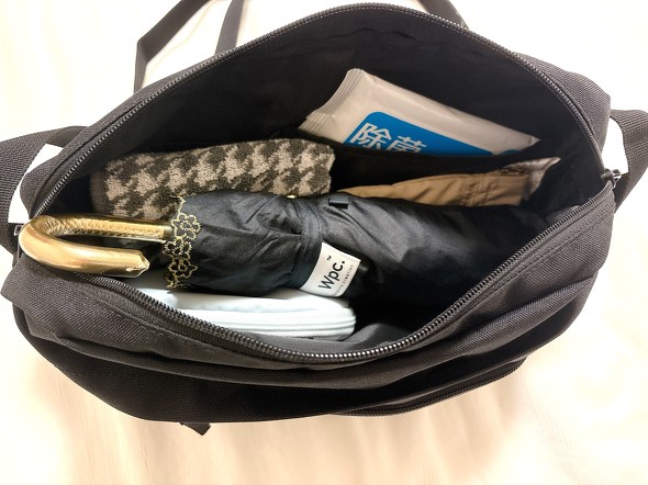 特に夏場に持ち歩く機会の多い、折りたたみの日傘や500mlのペットボトルが問題なく収まる点はうれしいポイント。暑い日に、日傘とハンドタオル、冷感ボディミスト(120ml)などの暑さ・汗対策グッズを身軽に持ち歩けます。