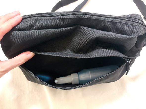 本体の前面には、大きなファスナー付きポケットがあります。マチがあるため、少し厚みのある小物も収納しやすいのがポイント。冷感ボディミストやイヤフォンケースなどが入ります。
