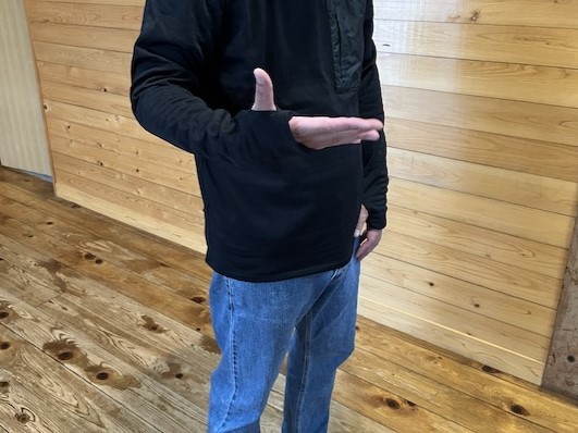 「シンボルフリースクルーネック」にはサムホールがあり、手の甲を覆えます。手首から入る冷気を防げますし、袖の裏地にもフリースがついているので、暖かさはバッチリです。