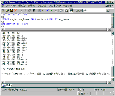 テーブル 'authors'。 スキャン回数 1,論理読み取り数 1,物理読み取り数 1,先行読み取り数 0。