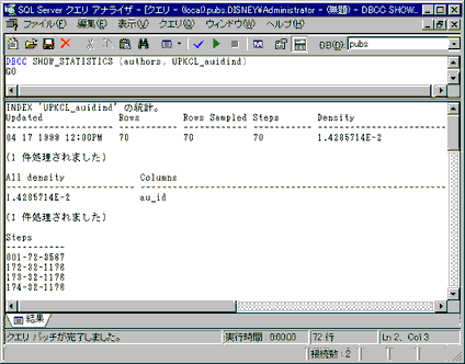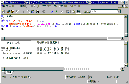 SELECT STATS_DATE (table-id, index-id) FROM sysindexesたとえば,pubsデータベースのauthorsテーブルに対してこのSQLステートメントを実行すると,次のような出力が得られる(table_idがわからない場合は,“SELECT id FROM sysobjects WHERE name = 'authors'”のように,sysobjectsシステムテーブルから取得する。index_idの場合も同じ方法で取得できる)。