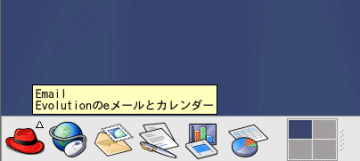 左側から「GNOMEメニュー」、Webブラウザ「Mozilla」、メール&スケジューラソフト「Ximian Evolution」、オフィスアプリケーションOpenOffice.orgの 「ワープロソフト」、「表計算」、「プレゼンテーション」ソフトのアイコンが並ぶ。