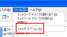 フォルダのメニューバーから「ツール」を選択すると、「フォルダオプション」が消えていることが分かる。再び表示させるには、先ほど作成した「NoFolderOptions」の値のデータを「0」に変更すればよいCopyright © ITmedia, Inc. All Rights Reserved.