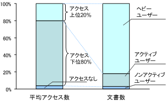 パレートの法則は、Notesの利用状況にも当てはまるケースが多い。各ユーザーの閲覧数を一定期間カウントし、下図のようなチャートを作ると、大体の場合において、全体の80%のアクセスをしている20%のヘビーユーザー、残り20%のアクセスを分け合うアクティブユーザー、ノンアクティブユーザーの3段階に分類できるケースが多い。後者2つの区分けにはログオンの頻度を用い、例えば連続3日間ログオンしていない、あるいは一度も文書にアクセスしていないユーザーをノンアクティブユーザーとすることができる。