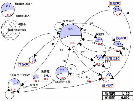部門やロケーションの視点が加わることで、情報の出し手と受け手の分布やそれぞれの経路で流れる情報の分量を「見える化」することができる。組織間の情報の輸出入の状況は、各部門の情報生産能力や利用状況を俯瞰(ふかん)するための分析である。