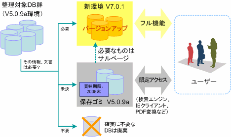 これほどまでにコンプライアンスが重要な視点となってしまった現在、その情報の正否も分からないまま、意図せず誤って情報を流通させてしまうリスクは避けなければならない。各DB単位、ものによっては文書単位で、その情報の内容に責任を持つ主管部門を定義できないみなしごDBは思い切って廃棄すべきである。