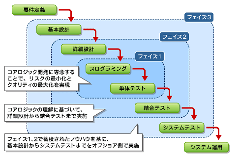 作業範囲を限定すると述べましたが、具体的には上図の知識・ノウハウ共有蓄積時においては、オフショア側の作業は製造部分(プログラミング⇒単体テスト)にのみに作業範囲を絞って実施するのもよいでしょう。