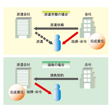 赤城 「うん、いい質問だ。例えば、ウチの会社によその会社の社員のAさんがいるとしよう。ウチの会社の社員がそのAさんに直接的に業務上の指揮命令をしているなら、それは基本的には派遣労働に該当することになるから、Aさんの会社は派遣業社の登録をしていなきゃならないし、派遣法の制約に従わなければならない。逆にウチの会社の社員は、Aさんに対する直接の指揮命令権は持たないで、Aさんがやるべき仕事の内容についてはAさんの所属する会社と協議して、Aさんの会社がAさんに指示を出すのであれば、それは基本的には請負に該当する。まぁ簡単にいえば、こんな感じだな」