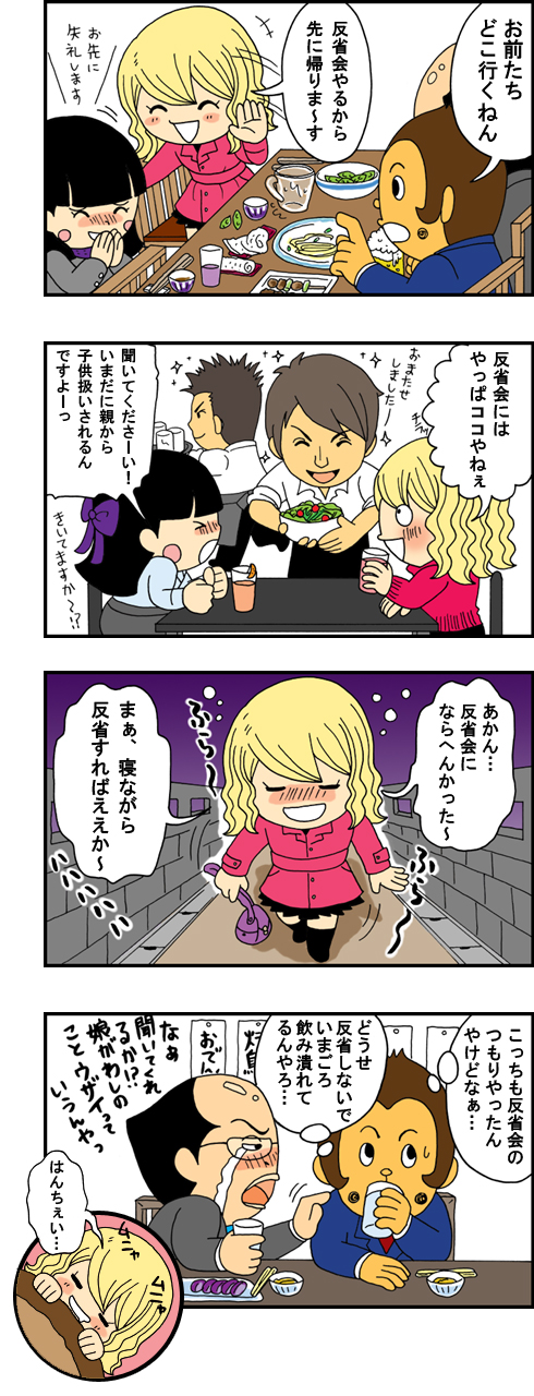 編集部から:そろそろ、忘年会シーズン。あどみちゃんやシスアド先輩たちも忘年会をすることに。でも、あどみちゃんとカルタちゃんの女性2人は、忘年会を早々に辞去して、イケメンがいる居酒屋で反省会をすることに。