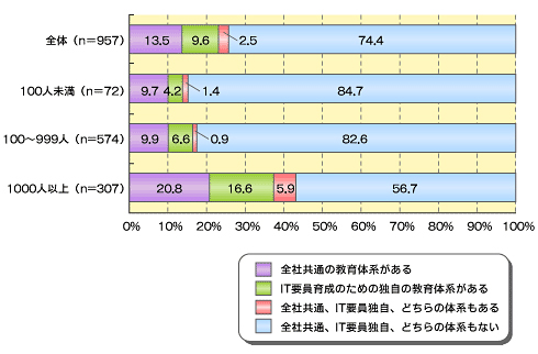 - 全社共通の教育体系がある」「IT要員育成のための独自の教育体系がある」「全社共通、IT要員独自、どちらの体系もある」を合わせて回答企業の約1/4。