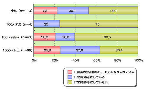 - ITスキル標準を「教育体系に取り入れている」あるいは「参考にしている」と回答した企業は教育体系を持つ企業の約半数(53.1%)。