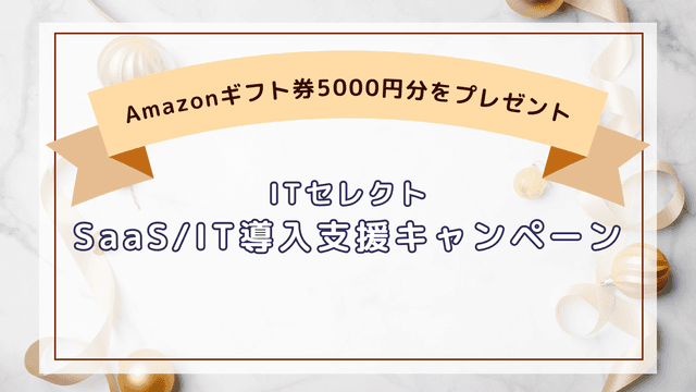 ITセレクトではSaaS・IT製品を導入したいけどなかなか行動に移せない、という方を応援する「SaaS/IT導入支援キャンペーン」を実施します!ITセレクト経由でSaaS・IT製品導入の相談の上製品紹介を受け、アンケート回答まで完了いただいた方(※)にもれなくAmazonギフト券5000円分をプレゼント!キャンペーンのご案内をご確認の上ぜひご参加ください。